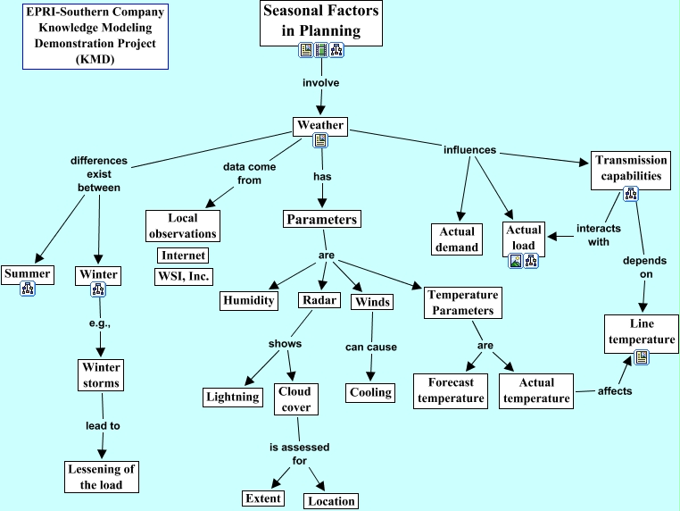 This Concept Map, created with IHMC CmapTools, has information related to: Seasonal Factors In Planning, Weather influences Transmission capabilities, Winter storms lead to Lessening of the load, Radar shows Cloud cover, Winds can cause Cooling, Parameters are Radar, Transmission capabilities interacts with Actual load, Seasonal Factors in Planning involve Weather, Weather influences Actual load, Radar shows Lightning, Weather data come from Local observations, Weather has Parameters, Weather differences exist between Winter, Temperature Parameters are Forecast temperature, Cloud cover is assessed for Location, Temperature Parameters are Actual temperature, Actual temperature affects Line temperature, Parameters are Humidity, Cloud cover is assessed for Extent, Weather influences Actual demand, Transmission capabilities depends on Line temperature
