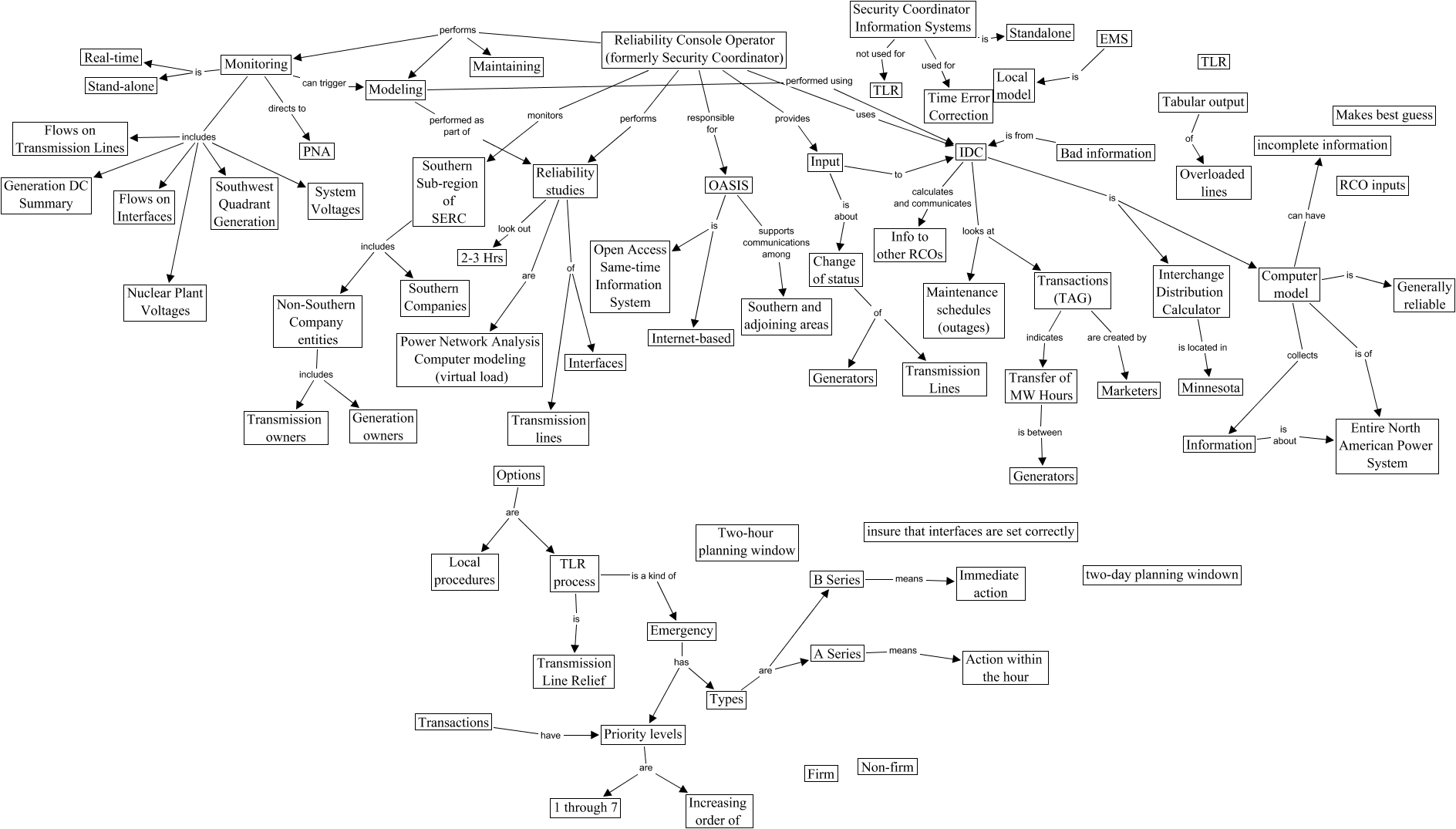 This Concept Map, created with IHMC CmapTools, has information related to: Reliability Console Operator, Reliability Console Operator (formerly Security Coordinator) uses IDC, Transactions have Priority levels, B Series means Immediate action, Reliability studies of Transmission lines, Transfer of MW Hours is between Generators, Modeling performed as part of Reliability studies, OASIS supports communications among Southern and adjoining areas, Input to IDC, A Series means Action within the hour, Non-Southern Company entities includes Transmission owners, Monitoring includes Nuclear Plant Voltages, Monitoring can trigger Modeling, Monitoring includes Flows on Interfaces, Emergency has Priority levels, Transactions (TAG) indicates Transfer of MW Hours, Security Coordinator Information Systems not used for TLR, IDC is Interchange Distribution Calculator, Options are TLR process, Reliability Console Operator (formerly Security Coordinator) performs Maintaining, Monitoring includes Southwest Quadrant Generation