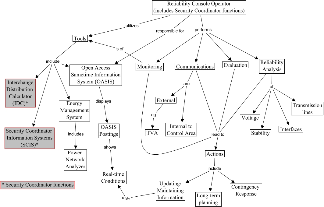 This Concept Map, created with IHMC CmapTools, has information related to: RCO Basic Responsibilities, Evaluation lead to Actions, Reliability Console Operator (includes Security Coordinator functions) utilizes Tools, External eg TVA, Updating/ Maintaining Information e.g., Real-time Conditions, Reliability Analysis lead to Actions, Tools include Interchange Distribution Calculator (IDC)*, Communications lead to Actions, Reliability Console Operator (includes Security Coordinator functions) performs Evaluation, Monitoring is of Tools, Monitoring lead to Actions, OASIS Postings shows Real-time Conditions, Communications are External, Reliability Analysis of Stability, Actions include Long-term planning, Reliability Console Operator (includes Security Coordinator functions) performs Monitoring, Tools include Security Coordinator Information Systems (SCIS)*, Actions include Updating/ Maintaining Information, Reliability Analysis of Transmission lines, Communications are Internal to Control Area, Tools include Open Access Sametime Information System (OASIS)