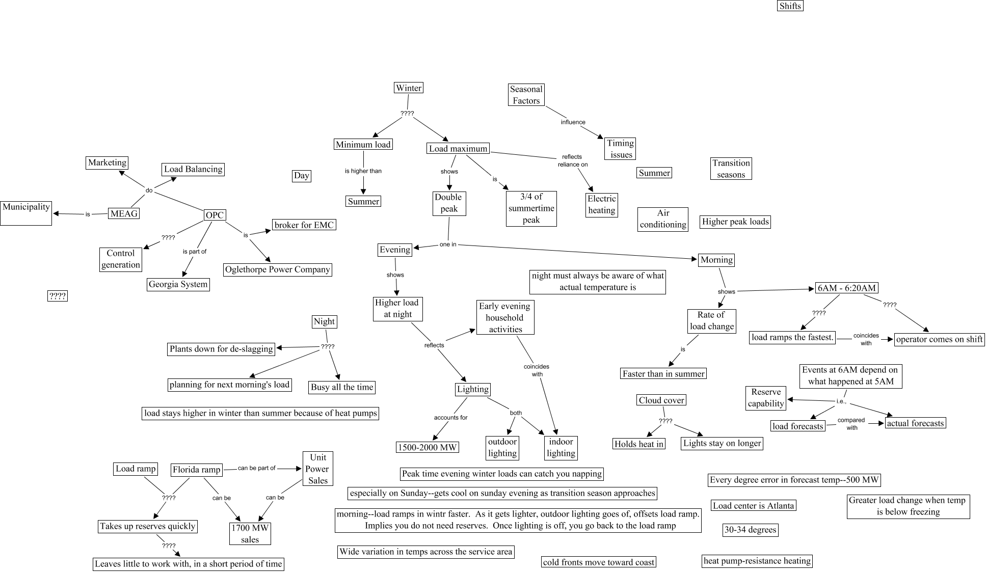 This Concept Map, created with IHMC CmapTools, has information related to: Seasonal Factors, MEAG do Marketing, MEAG is Municipality, Lighting both outdoor lighting, Takes up reserves quickly ???? Leaves little to work with, in a short period of time, 6AM - 6:20AM ???? load ramps the fastest., MEAG do Load Balancing, OPC do Load Balancing, Morning shows 6AM - 6:20AM, Load maximum shows Double peak, Night ???? Busy all the time, Double peak one in Morning, Rate of load change is Faster than in summer, Unit Power Sales can be 1700 MW sales, Higher load at night reflects Early evening household activities, load forecasts compared with actual forecasts, Events at 6AM depend on what happened at 5AM i.e., actual forecasts, Cloud cover ???? Holds heat in, Early evening household activities coincides with indoor lighting, Morning shows Rate of load change, Winter ???? Load maximum