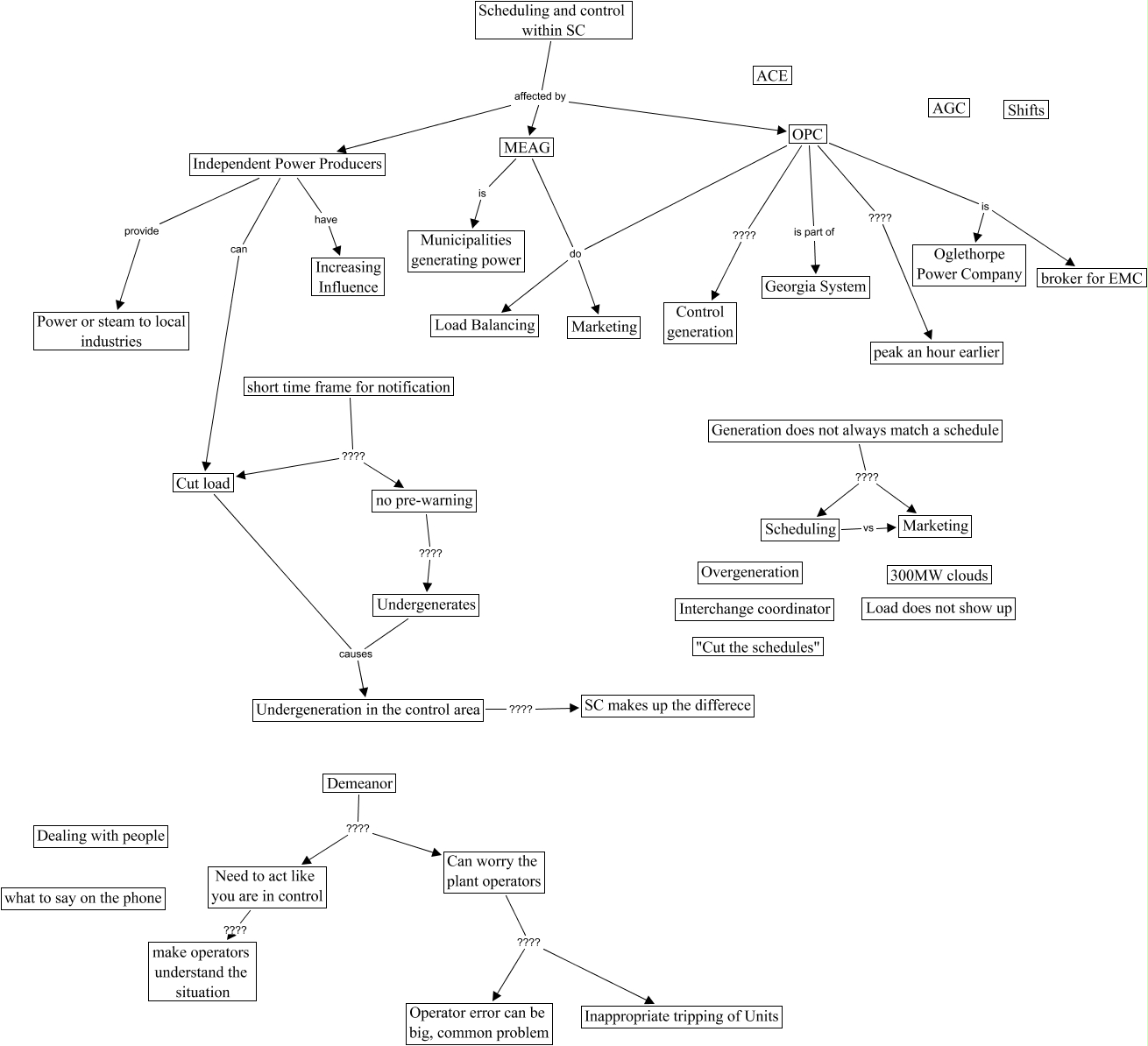 This Concept Map, created with IHMC CmapTools, has information related to: Companies, Scheduling and control within SC affected by MEAG, short time frame for notification ???? no pre-warning, MEAG do Load Balancing, no pre-warning ???? Undergenerates, Can worry the plant operators ???? Operator error can be big, common problem, MEAG do Marketing, Scheduling vs Marketing, Can worry the plant operators ???? Inappropriate tripping of Units, Demeanor ???? Need to act like you are in control, Undergeneration in the control area ???? SC makes up the differece, OPC ???? peak an hour earlier, OPC is part of Georgia System, Need to act like you are in control ???? make operators understand the situation, Independent Power Producers provide Power or steam to local industries, OPC ???? Control generation, Scheduling and control within SC affected by Independent Power Producers, Independent Power Producers can Cut load, OPC do Marketing, Undergenerates causes Undergeneration in the control area, OPC is broker for EMC