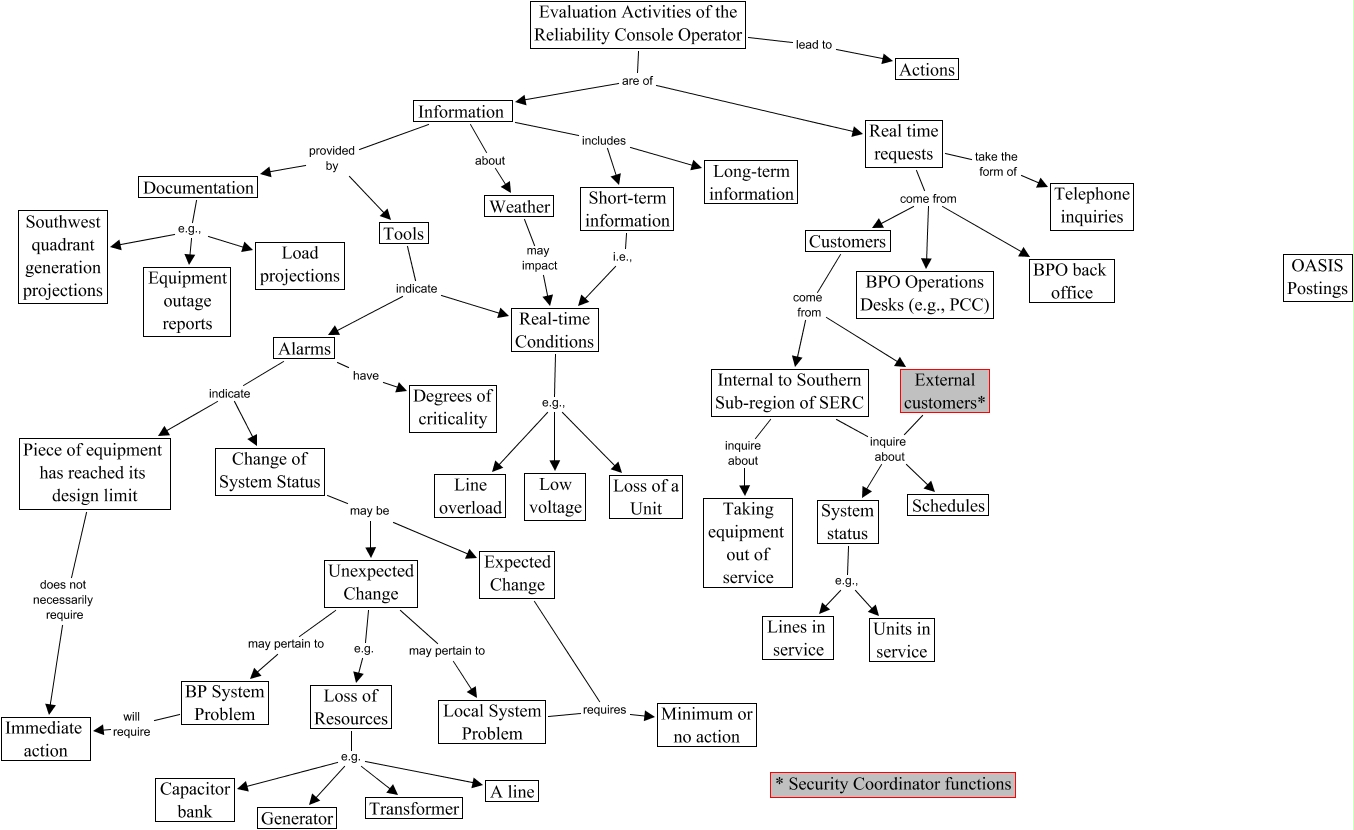 This Concept Map, created with IHMC CmapTools, has information related to: RCO_Evaluation, Information about Weather, Real time requests come from Customers, Loss of Resources e.g. Transformer, Real time requests come from BPO Operations Desks (e.g., PCC), Alarms indicate Change of System Status, System status e.g., Units in service, Real time requests come from BPO back office, Evaluation Activities of the Reliability Console Operator are of Real time requests, Evaluation Activities of the Reliability Console Operator are of Information, Piece of equipment has reached its design limit does not necessarily require Immediate action, Customers come from External customers*, Real-time Conditions e.g., Low voltage, Alarms indicate Piece of equipment has reached its design limit, External customers* inquire about Schedules, Documentation e.g., Southwest quadrant generation projections, Documentation e.g., Equipment outage reports, Real-time Conditions e.g., Loss of a Unit, Information includes Short-term information, System status e.g., Lines in service, Internal to Southern Sub-region of SERC inquire about Taking equipment out of service