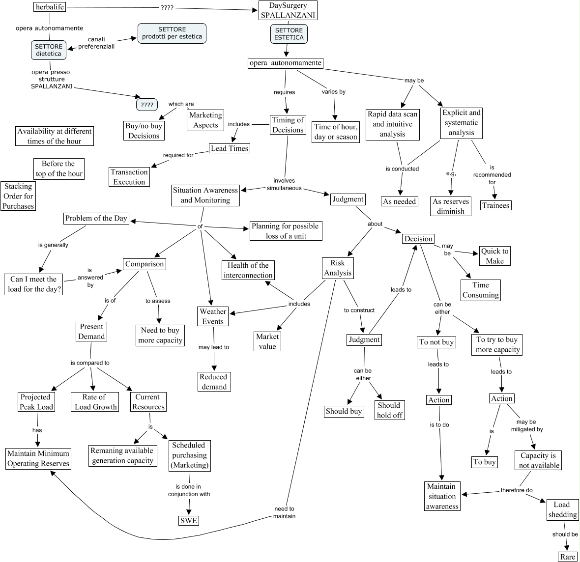 This Concept Map, created with IHMC CmapTools, has information related to: Load Balancing Process, Judgment can be either Should hold off, opera autonomamente may be Explicit and systematic analysis, Judgment leads to Decision, Timing of Decisions involves simultaneous Situation Awareness and Monitoring, Marketing Aspects which are Buy/no buy Decisions, Load shedding should be Rare, To not buy leads to Action, Judgment about Decision, Explicit and systematic analysis e.g, As reserves diminish, Situation Awareness and Monitoring of Health of the interconnection, Situation Awareness and Monitoring of Problem of the Day, Projected Peak Load has Maintain Minimum Operating Reserves, Risk Analysis includes Market value, herbalife opera autonomamente SETTORE dietetica, Weather Events may lead to Reduced demand, Judgment can be either Should buy, herbalife ???? DaySurgery SPALLANZANI, Comparison is of Present Demand, Risk Analysis includes Health of the interconnection, Present Demand is compared to Rate of Load Growth