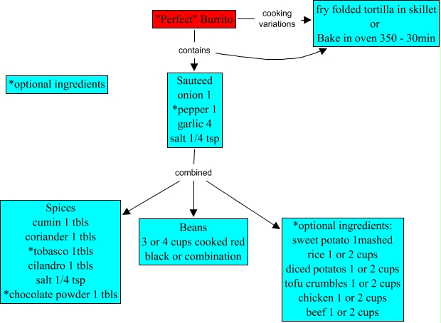 This Concept Map, created with IHMC CmapTools, has information related to: Recipe Overview, "Perfect" Burrito contains fry folded tortilla in skillet or Bake in oven 350 - 30min, "Perfect" Burrito cooking variations fry folded tortilla in skillet or Bake in oven 350 - 30min, Sauteed onion 1 *pepper 1 garlic 4 salt 1/4 tsp combined Spices cumin 1 tbls coriander 1 tbls *tobasco 1tbls cilandro 1 tbls salt 1/4 tsp *chocolate powder 1 tbls, "Perfect" Burrito contains Sauteed onion 1 *pepper 1 garlic 4 salt 1/4 tsp, Sauteed onion 1 *pepper 1 garlic 4 salt 1/4 tsp combined *optional ingredients: sweet potato 1mashed rice 1 or 2 cups diced potatos 1 or 2 cups tofu crumbles 1 or 2 cups chicken 1 or 2 cups beef 1 or 2 cups, Sauteed onion 1 *pepper 1 garlic 4 salt 1/4 tsp combined Beans 3 or 4 cups cooked red black or combination