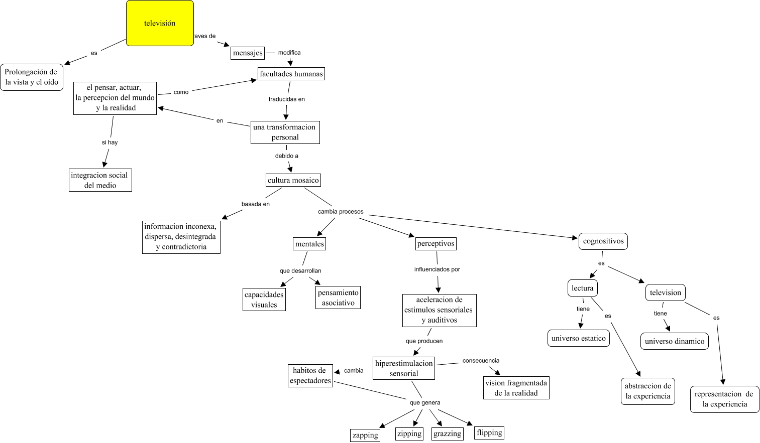 Este Cmap, tiene información relacionada con: MEDIO, habitos de espectadores que genera zipping, una transformacion personal debido a cultura mosaico, cultura mosaico cambia procesos perceptivos, hiperestimulacion sensorial que genera zapping, una transformacion personal en el pensar, actuar, la percepcion del mundo y la realidad, cultura mosaico cambia procesos cognositivos, cognositivos es television, perceptivos influenciados por aceleracion de estimulos sensoriales y auditivos, cultura mosaico cambia procesos mentales, hiperestimulacion sensorial cambia habitos de espectadores, aceleracion de estimulos sensoriales y auditivos que producen hiperestimulacion sensorial, cultura mosaico basada en informacion inconexa, dispersa, desintegrada y contradictoria, television tiene universo dinamico, televisión es Prolongación de la vista y el oído, el pensar, actuar, la percepcion del mundo y la realidad si hay integracion social del medio, televisión a traves de mensajes, mensajes modifica facultades humanas, habitos de espectadores que genera grazzing, hiperestimulacion sensorial que genera flipping, habitos de espectadores que genera flipping