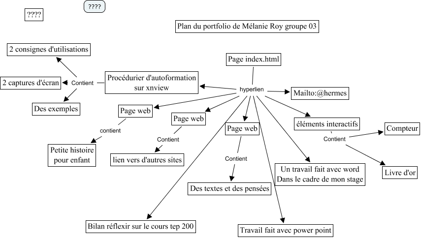 Este Cmap, tiene información relacionada con: planportfoliomelanie, Page web Contient lien vers d'autres sites, Page index.html hyperlien Page web, Page web contient Petite histoire pour enfant, Page index.html hyperlien éléments interactifs, Procédurier d'autoformation sur xnview Contient Des exemples, Page index.html hyperlien Bilan réflexir sur le cours tep 200, Page index.html hyperlien Un travail fait avec word Dans le cadre de mon stage, Page index.html hyperlien Travail fait avec power point, éléments interactifs Contient Livre d'or, Procédurier d'autoformation sur xnview Contient 2 captures d'écran, Page index.html hyperlien Page web, Page web Contient Des textes et des pensées, Page index.html hyperlien Procédurier d'autoformation sur xnview, Page index.html hyperlien Mailto:@hermes, éléments interactifs Contient Compteur, Procédurier d'autoformation sur xnview Contient 2 consignes d'utilisations, Page index.html hyperlien Page web