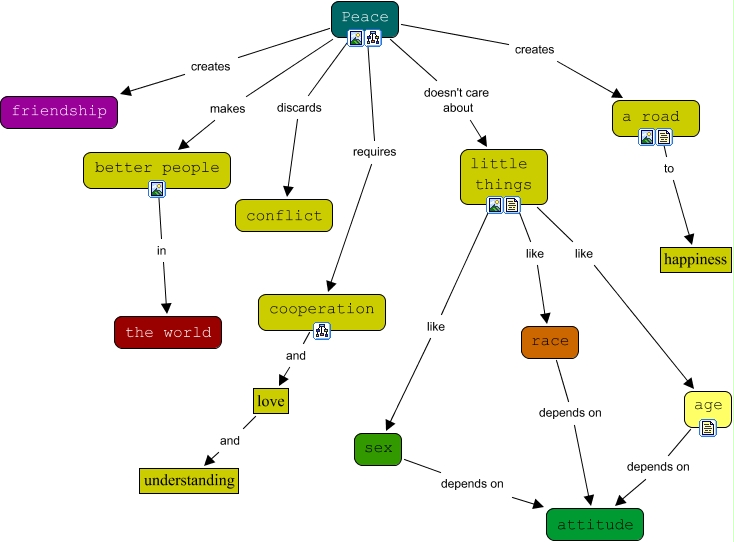 This Concept Map, created with IHMC CmapTools, has information related to: Plantas, little things like race, cooperation and love, better people in the world, Peace doesn't care about little things, Peace makes better people, Peace requires cooperation, Peace discards conflict, Peace creates a road, race depends on attitude, little things like age, a road to happiness, little things like sex, sex depends on attitude, Peace creates friendship, age depends on attitude, love and understanding