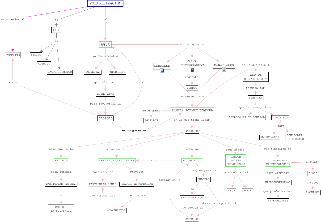 This Concept Map, created with IHMC CmapTools, has information related to: POTABILIZACIONOK, AGUA es recogida de MANATIALES, REACCIONES QUIMICAS que producen COMPUESTOS, PROCESO que finalizan en DEPURACION BACTERIOLOGICA, MICROORGANSIMOS que pueden causar ENFERMEDADES, AGUA ya que arrastra MICROBIOS, POTABILIZACION del AGUA, CALIDAD del AGUA, IMPUREZAS que deben ser ELIMINADAS, AGUA es recogida de EMBALSES, PROCESO como la FLOCULACION, POTABILIZACION su TIPO, MANATIALES se envia a una PLANTA POTABILIZADORA, CALIDAD se consigue en una PLANTA POTABILIZADORA, FLOCULO formado en la FLOCULACION, PRODUCTOS COAGULANTES provocan REACCIONES QUIMICAS, FLOCULACION con PRODUCTOS COAGULANTES, SEDIMENTACION que separa el FLOCULO, FLOCULACION despues pasa a CUBETAS, ELIMINADAS para recuperara la CALIDAD, FILTROS para retener PARTICULAS GRUESAS