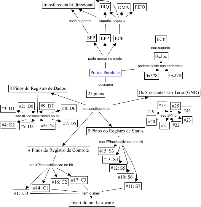 This Concept Map, created with IHMC CmapTools, has information related to: Portas Paralelas, 5 Pinos do Registro de Status sao #Pino:localizacao no bit #15: S3, 8 Pinos do Registro de Dados sao #Pino:localizacao no bit #3: D1, Portas Paralelas pode operar no modo EPP, Os 8 restantes sao Terra (GND) sao #Pino #25, 5 Pinos do Registro de Status sao #Pino:localizacao no bit #13: S4, Portas Paralelas pode operar no modo SPP, 4 Pinos do Registro de Controle sao #Pino:localizacao no bit #17: C3, EPP suporta IRQ, #1: C0 tem o sinal invertido por hardware, Os 8 restantes sao Terra (GND) sao #Pino #18, 8 Pinos do Registro de Dados sao #Pino:localizacao no bit #2: D0, #17: C3 tem o sinal invertido por hardware, Portas Paralelas podem existir nos enderecos 0x378, Os 8 restantes sao Terra (GND) sao #Pino #21, 5 Pinos do Registro de Status sao #Pino:localizacao no bit #12: S5, 8 Pinos do Registro de Dados sao #Pino:localizacao no bit #6: D4, 4 Pinos do Registro de Controle sao #Pino:localizacao no bit #16: C2, #11: S7 tem o sinal invertido por hardware, 25 pinos se constituem de 5 Pinos do Registro de Status, ECP suporta IRQ