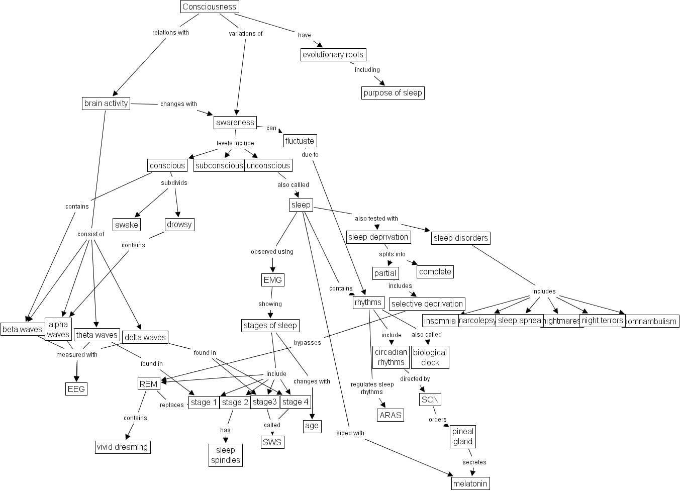unconscious also callled sleep, Consciousness relations with brain activity, brain activity changes with awareness, alpha waves measured with EEG, EMG showing stages of sleep, beta waves measured with EEG, sleep observed using EMG, stage3 called SWS, sleep aided with melatonin, evolutionary roots including purpose of sleep, stages of sleep include stage 4, stages of sleep include stage 1, stages of sleep include stage3, stages of sleep include REM, stages of sleep include stage 2, Consciousness have evolutionary roots, brain activity consist of beta waves, brain activity consist of alpha waves, brain activity consist of theta waves, brain activity consist of delta waves, REM replaces stage 1, conscious contains beta waves, sleep disorders includes narcolepsy, sleep disorders includes insomnia, sleep disorders includes somnambulism, sleep disorders includes night terrors, sleep disorders includes nightmares, sleep disorders includes sleep apnea, stages of sleep changes with age, delta waves measured with EEG, rhythms include circadian rhythms, awareness levels include unconscious, awareness levels include subconscious, awareness levels include conscious, stage 4 called SWS, conscious subdivids drowsy, conscious subdivids awake, theta waves measured with EEG, awareness can fluctuate, sleep deprivation splits into partial, sleep deprivation splits into complete, theta waves found in stage 1, pineal gland secretes melatonin, sleep also tested with sleep deprivation, sleep also tested with sleep disorders, selective deprivation bypasses REM, REM contains vivid dreaming, Consciousness variations of awareness, delta waves found in stage3, delta waves found in stage 4, drowsy contains alpha waves, fluctuate due to rhythms, rhythms also called biological clock, SCN orders pineal gland, stage 2 has sleep spindles, sleep contains rhythms, partial includes selective deprivation, rhythms regulates sleep rhythms ARAS, circadian rhythms directed by SCN