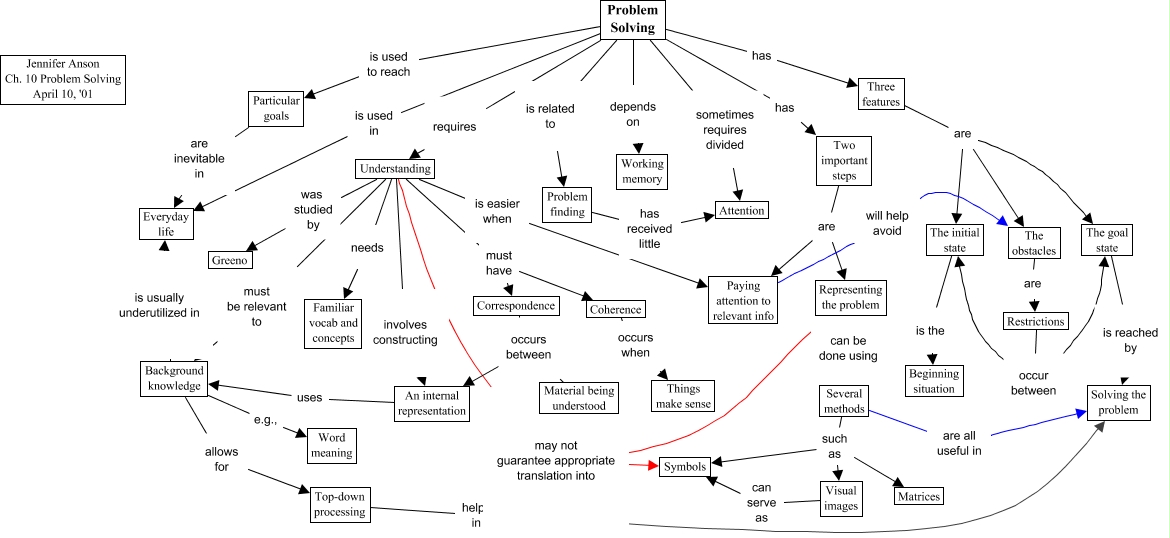 Esse mapa conceitual, produzido no IHMC CmapTools, tem a informação relacionada a: Problem Solving Approaches Version 6, Understanding may not guarantee appropriate translation into Symbols, The initial state is the Beginning situation, Three features are The obstacles, Restrictions occur between The goal state, Problem Solving requires Understanding, Several methods such as Matrices, Understanding must have Correspondence, Three features are The initial state, Problem Solving is used in Everyday life, Correspondence occurs between Material being understood, Background knowledge is usually underutilized in Everyday life, Understanding needs Familiar vocab and concepts, Understanding must have Coherence, Restrictions occur between The initial state, Several methods are all useful in Solving the problem, The goal state is reached by Solving the problem, Background knowledge e.g., Word meaning, Three features are The goal state, Problem Solving has Two important steps, Two important steps are Paying attention to relevant info