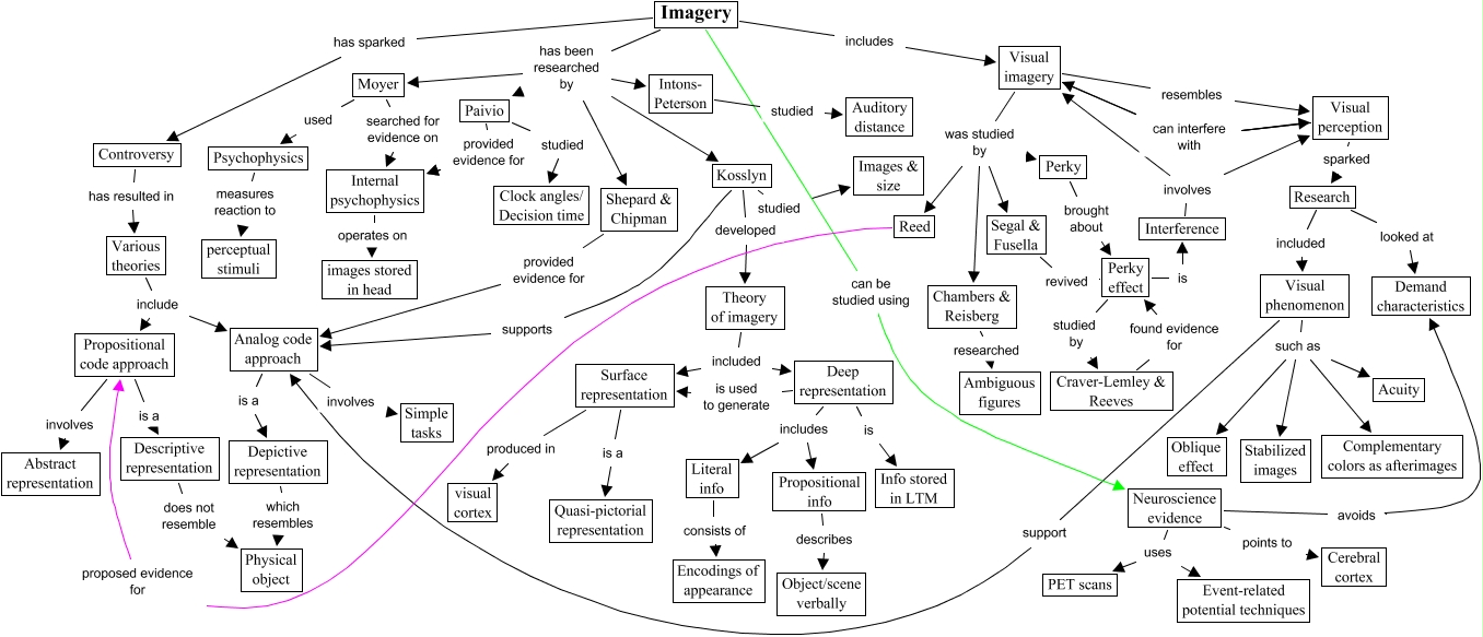 This Concept Map, created with IHMC CmapTools, has information related to: Imagery Version 1, Moyer used Psychophysics, Literal info consists of Encodings of appearance, Reed proposed evidence for Propositional code approach, Imagery includes Visual imagery, Kosslyn studied Images & size, Imagery has been researched by Moyer, Visual imagery was studied by Segal & Fusella, Imagery has been researched by Shepard & Chipman, Visual phenomenon such as Stabilized images, Kosslyn supports Analog code approach, Neuroscience evidence uses PET scans, Neuroscience evidence uses Event-related potential techniques, Internal psychophysics operates on images stored in head, Paivio provided evidence for Internal psychophysics, Theory of imagery included Surface representation, Visual phenomenon such as Complementary colors as afterimages, Shepard & Chipman provided evidence for Analog code approach, Psychophysics measures reaction to perceptual stimuli, Imagery has been researched by Kosslyn, Visual imagery can interfere with Visual perception