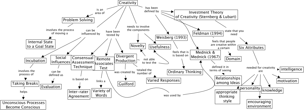 This Concept Map, created with IHMC CmapTools, has information related to: Creativity Version 1, Creativity needs to involve the components Novelty, Creativity is an area of Problem Solving, Creativity has been defined by Mednick & Mednick (1967), Mednick & Mednick (1967) defined it in terms of seeing Relationships among Ideas, Creativity has been defined by Weisberg (1993), Feldman (1994) feels that people are creative within a certain Domain, Creativity needs to involve the components Usefulness, Investment Theory of Creativity (Sternberg & Lubart) state that you need Six Attributes, Six Attributes needed for creativity are appropriate thinking style, Six Attributes needed for creativity are intelligence, Creativity have been tested by Divergent Production, Creativity have been tested by Consensual Assessment Technique, Creativity has been defined by Feldman (1994), Taking Breaks helps Unconscious Processes Become Conscious, Incubation involves the process of Taking Breaks, Divergent Production not able to test the Novelty, Six Attributes needed for creativity are encouraging environment, Creativity has been defined by Investment Theory of Creativity (Sternberg & Lubart), Six Attributes needed for creativity are personality, Creativity have been tested by Remote Associates Test