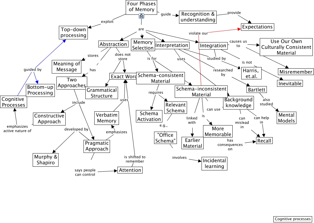 This Concept Map, created with IHMC CmapTools, has information related to: Semantic Memory - Schemas Version 4, Schema-inconsistent Material linked with Earlier Material, Pragmatic Approach emphasizes Verbatim Memory, Integration is not Inevitable, Cognitive Processes guided by Bottom-up Processing, Constructive Approach emphasizes active nature of Cognitive Processes, Interpretation studied by Harris, et.al., Four Phases of Memory are Integration, Integration causes us to Use Our Own Culturally Consistent Material, Pragmatic Approach developed by Murphy & Shapiro, Verbatim Memory uses Exact Words, Four Phases of Memory exploit Top-down processing, Schema-inconsistent Material can use Background knowledge, Cognitive Processes guided by Top-down processing, Background knowledge can help in Recall, Four Phases of Memory are Memory Selection, Schema-inconsistent Material is More Memorable, Schema-inconsistent Material violate our Expectations, Abstraction has Two Approaches, Attention is shifted to remember Exact Words, Memory Selection is for Schema-consistent Material