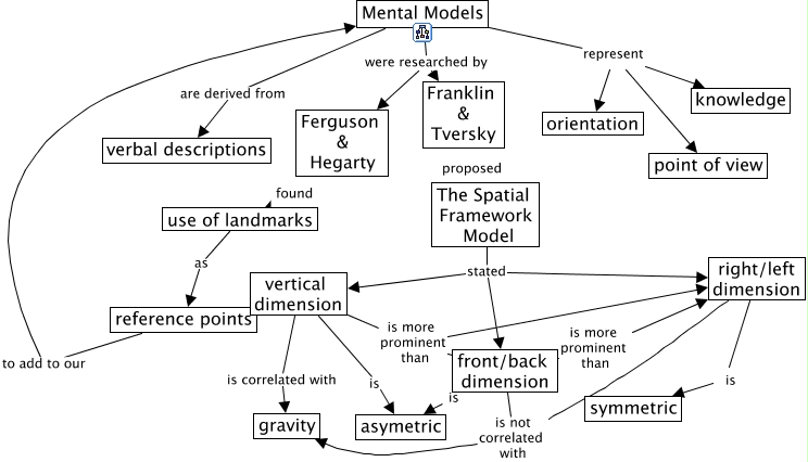 This Concept Map, created with IHMC CmapTools, has information related to: Imagery - Mental Models, Mental Models represent knowledge, vertical dimension is more prominent than right/left dimension, vertical dimension is correlated with gravity, right/left dimension is symmetric, The Spatial Framework Model stated front/back dimension, The Spatial Framework Model stated vertical dimension, vertical dimension is more prominent than front/back dimension, right/left dimension is not correlated with gravity, vertical dimension is asymetric, Mental Models are derived from verbal descriptions, Mental Models represent point of view, Mental Models were researched by Ferguson & Hegarty, front/back dimension is not correlated with gravity, Ferguson & Hegarty found use of landmarks, reference points to add to our Mental Models, Mental Models were researched by Franklin & Tversky, Mental Models represent orientation, The Spatial Framework Model stated right/left dimension, use of landmarks as reference points, front/back dimension is more prominent than right/left dimension