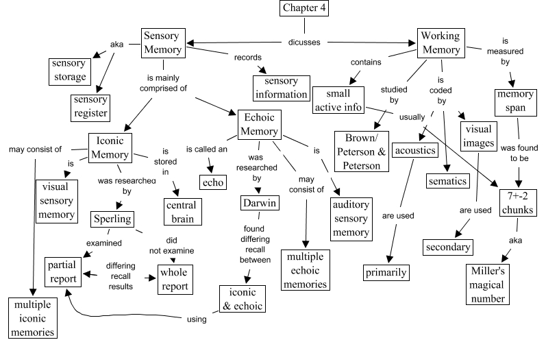 This Concept Map, created with IHMC CmapTools, has information related to: Memory - Sensory Memory and Short-Term Memory Version 2, Chapter 4 dicusses Sensory Memory, Working Memory studied by Brown/ Peterson & Peterson, memory span was found to be 7+-2 chunks, Working Memory is coded by acoustics, Darwin found differing recall between iconic & echoic, Echoic Memory is auditory sensory memory, Echoic Memory may consist of multiple echoic memories, Sperling examined partial report, partial report differing recall results whole report, Chapter 4 dicusses Working Memory, Iconic Memory may consist of multiple iconic memories, acoustics are used primarily, Echoic Memory was researched by Darwin, iconic & echoic using partial report, Iconic Memory was researched by Sperling, small active info usually 7+-2 chunks, Working Memory is measured by memory span, Echoic Memory is called an echo, Working Memory is coded by sematics, Working Memory is coded by visual images