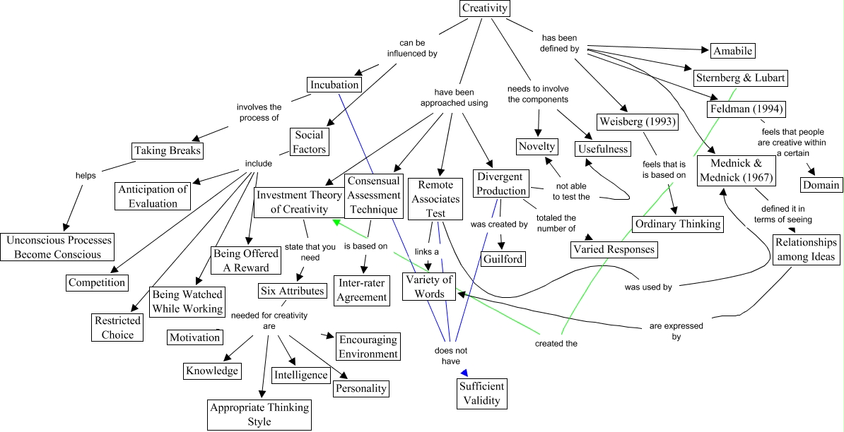This Concept Map, created with IHMC CmapTools, has information related to: Creativity Version 3, Mednick & Mednick (1967) defined it in terms of seeing Relationships among Ideas, Incubation involves the process of Taking Breaks, Weisberg (1993) feels that is is based on Ordinary Thinking, Creativity has been defined by Sternberg & Lubart, Social Factors include Restricted Choice, Six Attributes needed for creativity are Motivation, Social Factors include Being Watched While Working, Sternberg & Lubart created the Investment Theory of Creativity, Creativity has been defined by Mednick & Mednick (1967), Creativity have been approached using Remote Associates Test, Creativity needs to involve the components Novelty, Creativity has been defined by Weisberg (1993), Creativity can be influenced by Social Factors, Six Attributes needed for creativity are Knowledge, Creativity have been approached using Investment Theory of Creativity, Remote Associates Test was used by Mednick & Mednick (1967), Relationships among Ideas are expressed by Variety of Words, Taking Breaks helps Unconscious Processes Become Conscious, Six Attributes needed for creativity are Encouraging Environment, Divergent Production totaled the number of Varied Responses