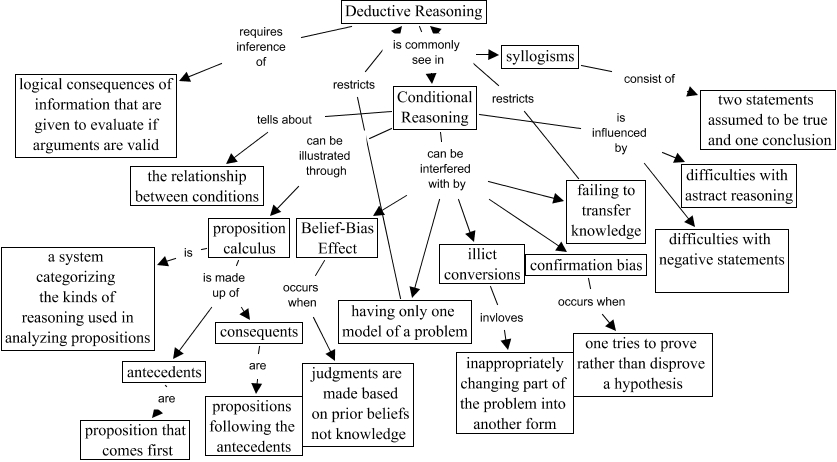 This Concept Map, created with IHMC CmapTools, has information related to: Deductive Reasoning Version 4, Conditional Reasoning can be interfered with by illict conversions, Deductive Reasoning requires inference of logical consequences of information that are given to evaluate if arguments are valid, failing to transfer knowledge restricts Deductive Reasoning, Belief-Bias Effect occurs when judgments are made based on prior beliefs not knowledge, proposition calculus is made up of antecedents, Conditional Reasoning can be interfered with by Belief-Bias Effect, Conditional Reasoning is influenced by difficulties with negative statements, Conditional Reasoning is influenced by difficulties with astract reasoning, Conditional Reasoning can be interfered with by having only one model of a problem, illict conversions invloves inappropriately changing part of the problem into another form, proposition calculus is made up of consequents, confirmation bias occurs when one tries to prove rather than disprove a hypothesis, proposition calculus is a system categorizing the kinds of reasoning used in analyzing propositions, Conditional Reasoning can be interfered with by confirmation bias, consequents are propositions following the antecedents, having only one model of a problem restricts Deductive Reasoning, Conditional Reasoning can be illustrated through proposition calculus, Deductive Reasoning is commonly see in syllogisms, antecedents are proposition that comes first, Conditional Reasoning can be interfered with by failing to transfer knowledge