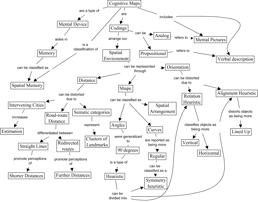 This Concept Map, created with IHMC CmapTools, has information related to: Imagery - Cognitive Maps Version 5, Road-route Distance differentiated between Straight Lines, 90 degrees is a type of Heuristic, Rotation Heuristic classifies objects as being more Horizontal, Orientation can be distorted due to Alignment Heuristic, Spatial Environment can be represented through Orientation, Orientation can be distorted due to Rotation Heuristic, Alignment Heuristic distorts objects as being more Lined Up, Cognitive Maps includes Verbal description, Straight Lines promote perceptions of Shorter Distances, Angles were generalized to 90 degrees, Cognitive Maps includes Mental Pictures, Distance can be distorted due to Road-route Distance, Curves are reported as being more Regular, Intervening Cities increases Estimation, Heuristic can be divided into Symmetry heuristic, Spatial Environment can be represented through Shape, Cognitive Maps is a classification of Spatial Memory, Shape can be classified as Curves, Shape can be classified as Spatial Arrangement, Codings arrange our Spatial Environment