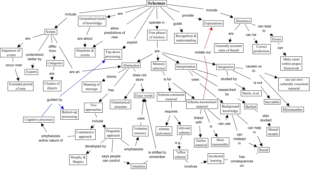 Este Cmap, tiene información relacionada con: Semantic Memory - Schemas Version 1, relevant schema e.g., "office schema", Schemas guide Recognition & understanding, Memory selection is for Schema-consistent material, Incidental learning has consequences on Recall, Heuristics can lead to Errors, Four phases of memory are Interpretation, Four phases of memory are Memory selection, Schema-inconsistent material can use Background knowledge, Heuristics can be Correct predictions, Scripts are an Abstraction, Background knowledge can help in Recall, "office schema" involves Incidental learning, Attention is shifted to remember Exact words, Four phases of memory are Abstraction, Scripts are Sequences of events, Integration studied by Harris, et.al., Schema-inconsistent material violate our Expectations, Pragmatic approach developed by Murphy & Shapiro, Sequences of events occur over Extended period of time, Interpretation uses Background knowledge