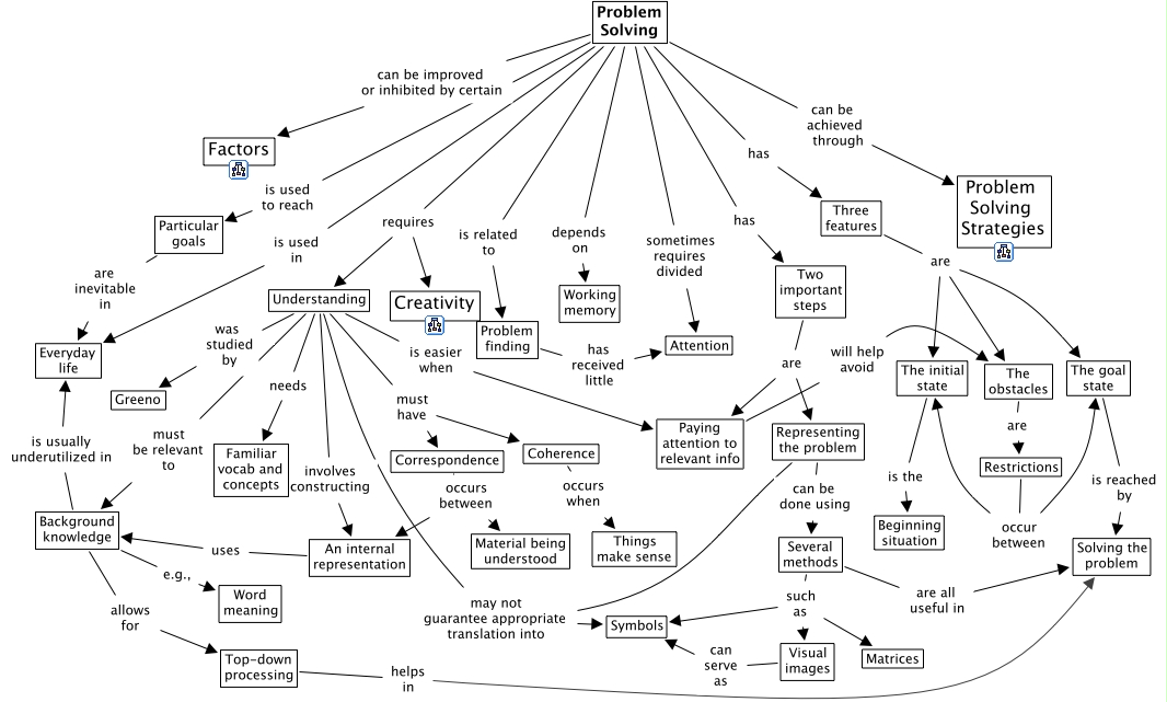 This Concept Map, created with IHMC CmapTools, has information related to: Problem Solving Top Map, Problem finding has received little Attention, Understanding must have Coherence, Problem Solving is related to Problem finding, Understanding is easier when Paying attention to relevant info, Representing the problem may not guarantee appropriate translation into Symbols, Problem Solving is used to reach Particular goals, Three features are The goal state, Background knowledge e.g., Word meaning, Understanding must be relevant to Background knowledge, Two important steps are Paying attention to relevant info, Problem Solving can be achieved through Problem Solving Strategies, Correspondence occurs between An internal representation, The initial state is the Beginning situation, The goal state is reached by Solving the problem, Problem Solving sometimes requires divided Attention, Several methods such as Matrices, Background knowledge is usually underutilized in Everyday life, Problem Solving can be improved or inhibited by certain Factors, Problem Solving requires Understanding, Coherence occurs when Things make sense