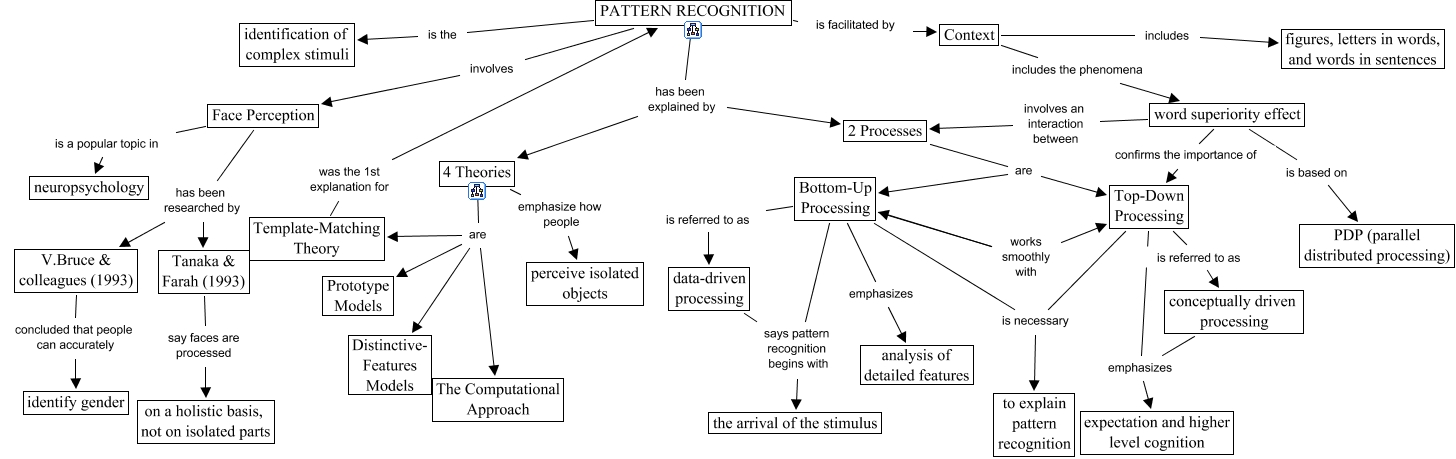 Questa Cmap, creata con IHMC CmapTools, contiene informazioni relative a: Pattern Recognition Version 2, Context includes figures, letters in words, and words in sentences, Context includes the phenomena word superiority effect, V.Bruce & colleagues (1993) concluded that people can accurately identify gender, Top-Down Processing is necessary to explain pattern recognition, PATTERN RECOGNITION is facilitated by Context, Bottom-Up Processing says pattern recognition begins with the arrival of the stimulus, 4 Theories are Distinctive- Features Models, 2 Processes are Bottom-Up Processing, Face Perception is a popular topic in neuropsychology, 4 Theories emphasize how people perceive isolated objects, Bottom-Up Processing works smoothly with Top-Down Processing, Top-Down Processing emphasizes expectation and higher level cognition, Tanaka & Farah (1993) say faces are processed on a holistic basis, not on isolated parts, 2 Processes are Top-Down Processing, 4 Theories are Template-Matching Theory, PATTERN RECOGNITION involves Face Perception, PATTERN RECOGNITION has been explained by 4 Theories, word superiority effect is based on PDP (parallel distributed processing), Bottom-Up Processing is necessary to explain pattern recognition, Top-Down Processing is referred to as conceptually driven processing