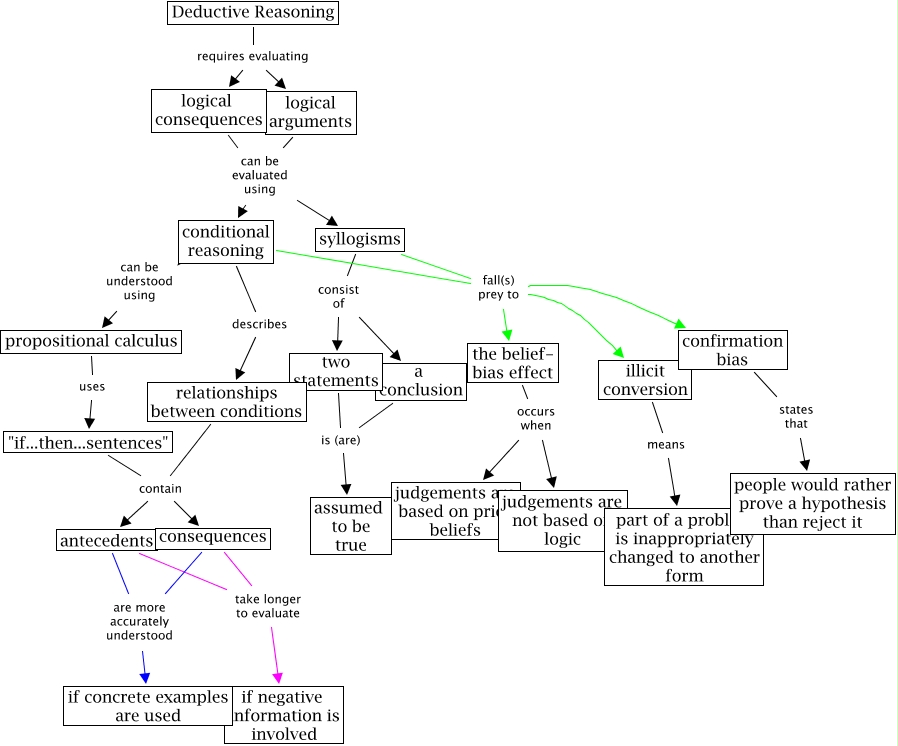 This Concept Map, created with IHMC CmapTools, has information related to: Deductive Reasoning Version 2, conditional reasoning fall(s) prey to illicit conversion, logical arguments can be evaluated using conditional reasoning, syllogisms fall(s) prey to the belief- bias effect, relationships between conditions contain consequences, syllogisms fall(s) prey to illicit conversion, "if...then...sentences" contain antecedents, Deductive Reasoning requires evaluating logical arguments, confirmation bias states that people would rather prove a hypothesis than reject it, illicit conversion means part of a problem is inappropriately changed to another form, the belief- bias effect occurs when judgements are based on prior beliefs, antecedents take longer to evaluate if negative information is involved, consequences are more accurately understood if concrete examples are used, logical consequences can be evaluated using conditional reasoning, logical arguments can be evaluated using syllogisms, a conclusion is (are) assumed to be true, relationships between conditions contain antecedents, conditional reasoning describes relationships between conditions, two statements is (are) assumed to be true, Deductive Reasoning requires evaluating logical consequences, conditional reasoning fall(s) prey to confirmation bias