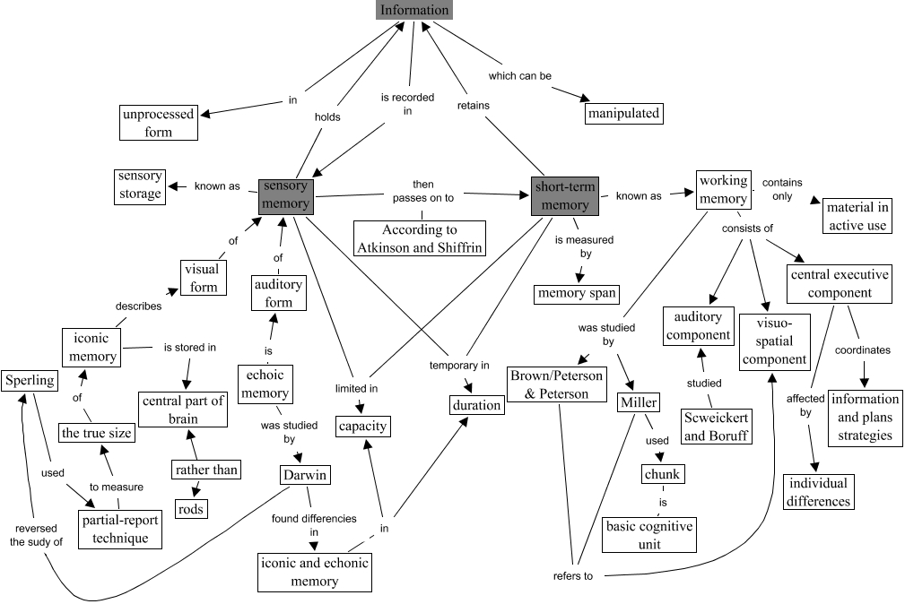 This Concept Map, created with IHMC CmapTools, has information related to: Memory - Modal Model, working memory consists of visuo- spatial component, chunk is basic cognitive unit, auditory form of sensory memory, Information is recorded in sensory memory, Darwin reversed the sudy of Sperling, Information in unprocessed form, Scweickert and Boruff studied auditory component, echoic memory was studied by Darwin, Brown/Peterson & Peterson refers to visuo- spatial component, sensory memory holds Information, iconic memory describes visual form, working memory consists of central executive component, Information which can be manipulated, iconic and echonic memory in duration, rather than ???? central part of brain, working memory was studied by Miller, rather than in rods, iconic and echonic memory in capacity, Sperling used partial-report technique, short-term memory limited in capacity