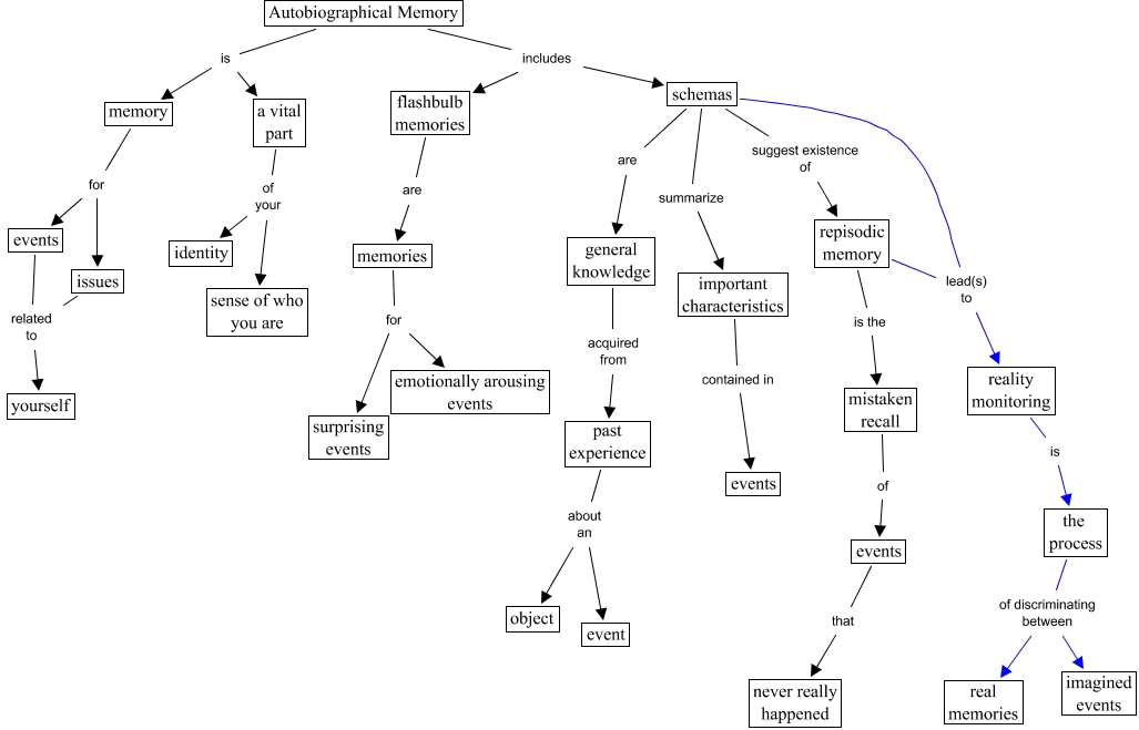 This Concept Map, created with IHMC CmapTools, has information related to: Memory - Autobiographical Version 3, flashbulb memories are memories, a vital part of your identity, reality monitoring is the process, repisodic memory lead(s) to reality monitoring, important characteristics contained in events, schemas lead(s) to reality monitoring, memory for issues, schemas summarize important characteristics, memories for surprising events, Autobiographical Memory includes flashbulb memories, the process of discriminating between imagined events, Autobiographical Memory includes schemas, schemas are general knowledge, events that never really happened, schemas suggest existence of repisodic memory, Autobiographical Memory is memory, mistaken recall of events, past experience about an object, events related to yourself, past experience about an event