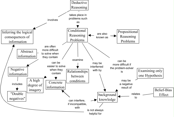 This Concept Map, created with IHMC CmapTools, has information related to: Deductive Reasoning Version 7, background knowledge is not always helpful for Inferring the logical consequences of information, Conditional Reasoning Problems examine Relationships between conditions, Conditional Reasoning Problems may be interferred with by background knowledge, Belief-Bias Effect relates to background knowledge, Concrete information can interfere, if incompatible, with background knowledge, Conditional Reasoning Problems are often more difficult to solve when they contain Abstract information, Examining only one Hypothesis may be a negative result of background knowledge, Deductive Reasoning takes place in problems such as Conditional Reasoning Problems, Conditional Reasoning Problems can be easier to solve when they contain Concrete information, Conditional Reasoning Problems are often more difficult to solve when they contain Negative information, Negative information includes "Double negatives", Deductive Reasoning involves Inferring the logical consequences of information, Propositional Reasoning Problems are also known as Conditional Reasoning Problems, Conditional Reasoning Problems can be easier to solve when they contain A high degree of imagery, Conditional Reasoning Problems can be more difficult if the problem-solver is Examining only one Hypothesis