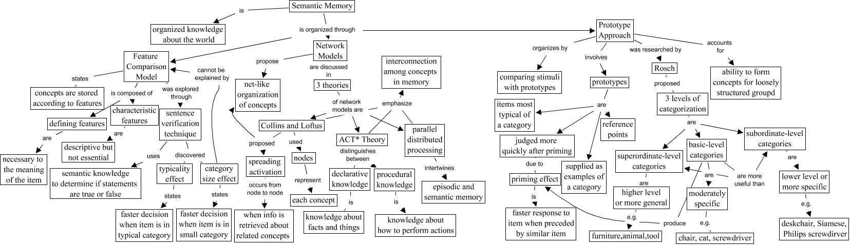 This Concept Map, created with IHMC CmapTools, has information related to: Semantic Memory Version 1, defining features are necessary to the meaning of the item, declarative knowledge is knowledge about facts and things, Prototype Approach involves prototypes, 3 theories of network models are ACT* Theory, 3 theories of network models are parallel distributed processing, Feature Comparison Model is composed of characteristic features, sentence verification technique discovered category size effect, 3 theories of network models are Collins and Loftus, Prototype Approach was researched by Rosch, Feature Comparison Model is composed of defining features, priming effect is faster response to item when preceded by similar item, basic-level categories are more useful than subordinate-level categories, Feature Comparison Model was explored through sentence verification technique, lower level or more specific e.g. deskchair, Siamese, Philips screwdirver, Collins and Loftus used nodes, 3 levels of categorization are subordinate-level categories, superordinate-level categories are higher level or more general, characteristic features are descriptive but not essential, prototypes are reference points, ACT* Theory distinguishes between declarative knowledge
