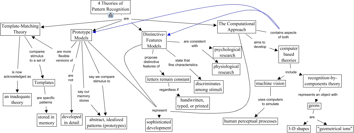 Questa Cmap, creata con IHMC CmapTools, contiene informazioni relative a: Pattern Recognition - Theories, geons are "geometrical ions", Prototype Models say we compare stimulus to abstract, idealized patterns (prototypes), Distinctive- Features Models are consistent with physiological research, letters remain constant regardless if handwritten, typed, or printed, machine vision uses computers to simulate human perceptual processes, The Computational Approach contains aspects of both Distinctive- Features Models, 4 Theories of Pattern Recognition are Prototype Models, Template-Matching Theory compares stimulus to a set of Templates, computer based theories include machine vision, The Computational Approach contains aspects of both Prototype Models, Template-Matching Theory is now acknowledged as an inadequate theory, 4 Theories of Pattern Recognition are Distinctive- Features Models, 4 Theories of Pattern Recognition are The Computational Approach, Distinctive- Features Models state that fine characteristics discriminates among stimuli, 4 Theories of Pattern Recognition are Template-Matching Theory, recognition-by- components theory represents an object with geons, Prototype Models represent sophisticated development, Prototype Models say our memory stores abstract, idealized patterns (prototypes), geons are 3-D shapes, Templates are specific patterns stored in memory