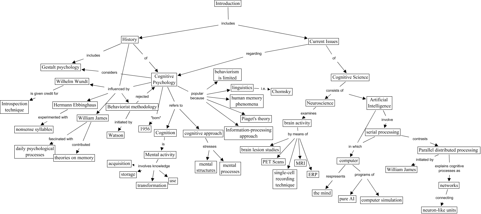 This Concept Map, created with IHMC CmapTools, has information related to: Introduction Version 2, serial processing in which computer, cognitive approach stresses mental processes, serial processing contrasts Parallel distributed processing, Current Issues regarding Cognitive Psychology, Cognition is Mental activity, brain activity by means of PET Scans, brain activity by means of single-cell recording technique, brain activity by means of brain lesion studies, Introduction includes History, Neuroscience examines brain activity, History of Cognitive Psychology, linguistics i.e. Chomsky, William James contributed theories on memory, networks connecting neuron-like units, Parallel distributed processing explains cognitive processes as networks, History influenced by William James, Cognitive Psychology influenced by William James, Cognitive Psychology popular because linguistics, Cognitive Science consists of Neuroscience, Hermann Ebbinghaus experimented with nonsense syllables