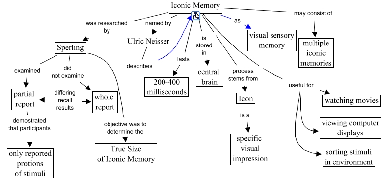 This Concept Map, created with IHMC CmapTools, has information related to: Memory - Iconic Memory, Iconic Memory useful for viewing computer displays, Ulric Neisser describes Iconic Memory, Iconic Memory may consist of multiple iconic memories, Sperling objective was to determine the True Size of Iconic Memory, Icon is a specific visual impression, Iconic Memory was researched by Sperling, Iconic Memory is stored in central brain, Iconic Memory lasts 200-400 milliseconds, partial report differing recall results whole report, Iconic Memory useful for watching movies, Iconic Memory process stems from Icon, Iconic Memory as visual sensory memory, partial report demostrated that participants only reported protions of stimuli, Sperling examined partial report, Iconic Memory named by Ulric Neisser, Iconic Memory useful for sorting stimuli in environment, Sperling did not examine whole report