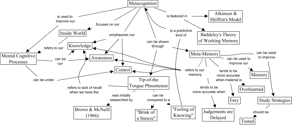 This Concept Map, created with IHMC CmapTools, has information related to: Metacognition Version 3, Metacognition emphasizes our Control, Meta-Memory refers to our memory Awareness, Meta-Memory refers to our memory Control, Meta-Memory tends to be more accurate when material is Overlearned, Meta-Memory tends to be more accurate when Judgements are Delayed, Mental Cognitive Processes can be under Control, Tip-of-the Tongue Phnomenon refers to lack of recall when we have the Knowledge, "Feeling of Knowing" is a predictive kind of Metacognition, Tip-of-the Tongue Phnomenon was initially researched by Brown & McNeill (1966), Metacognition can be shown through Meta-Memory, Study Strategies should be Tested, Inside World refers to our Mental Cognitive Processes, Metacognition is used to improve our Mental Cognitive Processes, Meta-Memory can be used to improve our Memory, Metacognition focuses on our Inside World, Tip-of-the Tongue Phnomenon can be compared to a "Brink of a Sneeze", Tip-of-the Tongue Phnomenon can be compared to a "Feeling of Knowing", Metacognition is featured in Atkinson & Shiffrin's Model, Meta-Memory can be used to improve Study Strategies, Mental Cognitive Processes can be our Knowledge