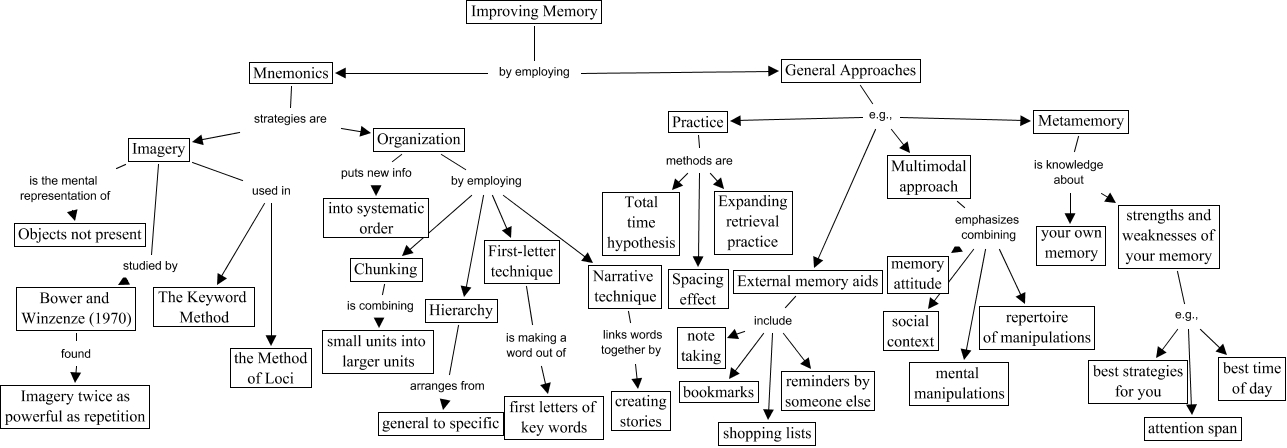 This Concept Map, created with IHMC CmapTools, has information related to: Memory - Improvement Version 2, Mnemonics strategies are Imagery, Narrative technique links words together by creating stories, Practice methods are Total time hypothesis, Imagery used in the Method of Loci, External memory aids include shopping lists, Organization by employing Chunking, Metamemory is knowledge about your own memory, Hierarchy arranges from general to specific, Chunking is combining small units into larger units, General Approaches e.g., Metamemory, Imagery used in The Keyword Method, Imagery studied by Bower and Winzenze (1970), Organization by employing First-letter technique, strengths and weaknesses of your memory e.g., best strategies for you, Organization puts new info into systematic order, General Approaches e.g., Multimodal approach, Multimodal approach emphasizes combining memory attitude, Improving Memory by employing Mnemonics, External memory aids include bookmarks, First-letter technique is making a word out of first letters of key words
