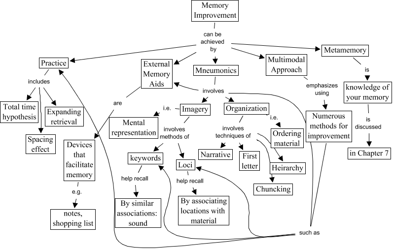 This Concept Map, created with IHMC CmapTools, has information related to: Memory - Improvement Version 1, Memory Improvement can be achieved by Mneumonics, knowledge of your memory is discussed in Chapter 7, Practice includes Expanding retrieval, Numerous methods for improvement such as Loci, Memory Improvement can be achieved by Metamemory, Organization involves techniques of Chuncking, Organization i.e. Ordering material, Numerous methods for improvement such as Practice, Imagery i.e. Mental representation, Memory Improvement can be achieved by External Memory Aids, Loci help recall By associating locations with material, Devices that facilitate memory e.g. notes, shopping list, Mneumonics involves Organization, External Memory Aids are Devices that facilitate memory, Organization involves techniques of First letter, Organization involves techniques of Narrative, Practice includes Total time hypothesis, Numerous methods for improvement such as External Memory Aids, Memory Improvement can be achieved by Multimodal Approach, Mneumonics involves Imagery