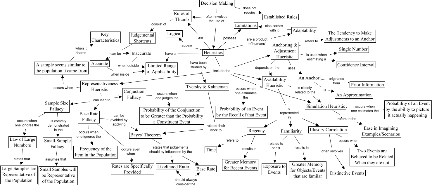 This Concept Map, created with IHMC CmapTools, has information related to: Decision Making Version 2, Heuristics include the Availability Hueristic, Tversky & Kahneman related their work to Bayes' Theorem, Judgemental Shortcuts can be Inaccurate, Regency results in Greater Memory for Recent Events, Law of Large Numbers states that Large Samples are Representative of the Population, Representativeness Hueristic can lead to Sample Size Fallacy, Familiarity relates to one's Exposure to Events, Sample Size Fallacy is commly demonstrated in the Small-Sample Fallacy, Anchoring & Adjustment Huerisitc depends on the Availability Hueristic, An Anchor originates from Prior Information, Familiarity results in Greater Memory for Objects/Events that are familar, A sample seems similar to the population it came from when it shares Key Characteristics, Bayes' Theorem states that judgements should by influenced by the Base Rate, Accurate when inside Limited Range of Applicability, Decision Making often involves the use of Heuristics, Simulation Heuristic refers to the Ease in Imagining Examples/Scenarios, Base Rate Fallacy occurs when one ignores the Frequency of the Item in the Population, Anchoring & Adjustment Huerisitc is used when estimating a Confidence Interval, Heuristics have a Limited Range of Applicability, Base Rate Fallacy occurs even when Rates are Specifically Provided
