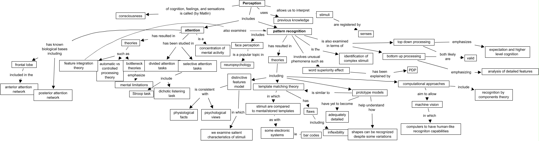 This Concept Map, created with IHMC CmapTools, has information related to: Perception Version 5, face perception is a popular topic in neuropsychology, Perception uses previous knowledge, distinctive features model in which we examine salient characteristics of stimuli, theories such as automatic vs controlled processing theory, attention has known biological bases including frontal lobe, bottom up processing emphasizing analysis of detailed features, pattern recognition is also examined in terms of top down processing, attention has known biological bases including posterior attention network, prototype models have yet to become adequately detailed, theories including computational approaches, stimuli are registered by senses, distinctive features model is consistent with psychological views, attention has resulted in theories, bottom up processing both likely are valid, theories including prototype models, flaws including inflexibility, attention has been studied in divided attention tasks, pattern recognition is the identification of complex stimuli, pattern recognition includes face perception, selective attention tasks include dichotic listening task