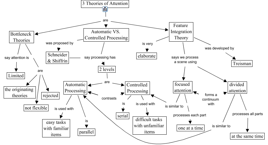 This Concept Map, created with IHMC CmapTools, has information related to: Attention - Theories, focused attention forms a continuum with divided attention, Controlled Processing is used with difficult tasks with unfamiliar items, Feature Integration Theory is very elaborate, 3 Theories of Attention are Automatic VS. Controlled Processing, focused attention is similar to Controlled Processing, divided attention processes all parts at the same time, Feature Integration Theory says we process a scene using divided attention, Automatic Processing is used with easy tasks with familiar items, Schneider & Shiffrin say processing has 2 levels, Automatic Processing contrasts Controlled Processing, Automatic Processing is parallel, Bottleneck Theories say attention is Limited, 2 levels are Automatic Processing, 2 levels are Controlled Processing, divided attention is similar to Automatic Processing, Feature Integration Theory was developed by Treisman, Automatic VS. Controlled Processing say processing has 2 levels, focused attention processes each part one at a time, Feature Integration Theory says we process a scene using focused attention, Bottleneck Theories are not flexible
