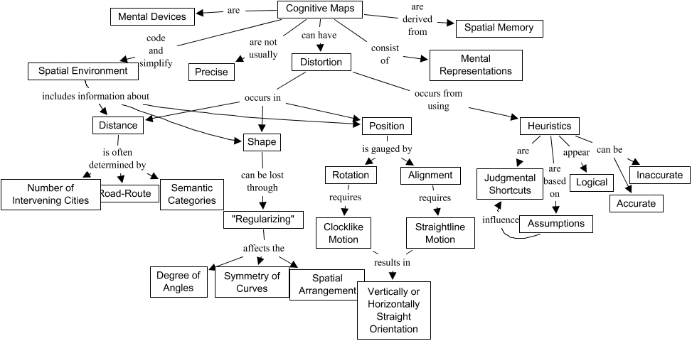 This Concept Map, created with IHMC CmapTools, has information related to: Imagery - Cognitive Maps Version 4, Heuristics are based on Assumptions, Heuristics are Judgmental Shortcuts, Clocklike Motion results in Vertically or Horizontally Straight Orientation, Cognitive Maps are Mental Devices, Distortion occurs from using Heuristics, Straightline Motion results in Vertically or Horizontally Straight Orientation, Cognitive Maps consist of Mental Representations, Heuristics can be Accurate, Heuristics appear Logical, Cognitive Maps can have Distortion, Position is gauged by Rotation, Rotation requires Clocklike Motion, Spatial Environment includes information about Position, Heuristics can be Inaccurate, Distortion occurs in Shape, Cognitive Maps are not usually Precise, "Regularizing" affects the Spatial Arrangement, Distance is often determined by Number of Intervening Cities, Position is gauged by Alignment, Shape can be lost through "Regularizing"