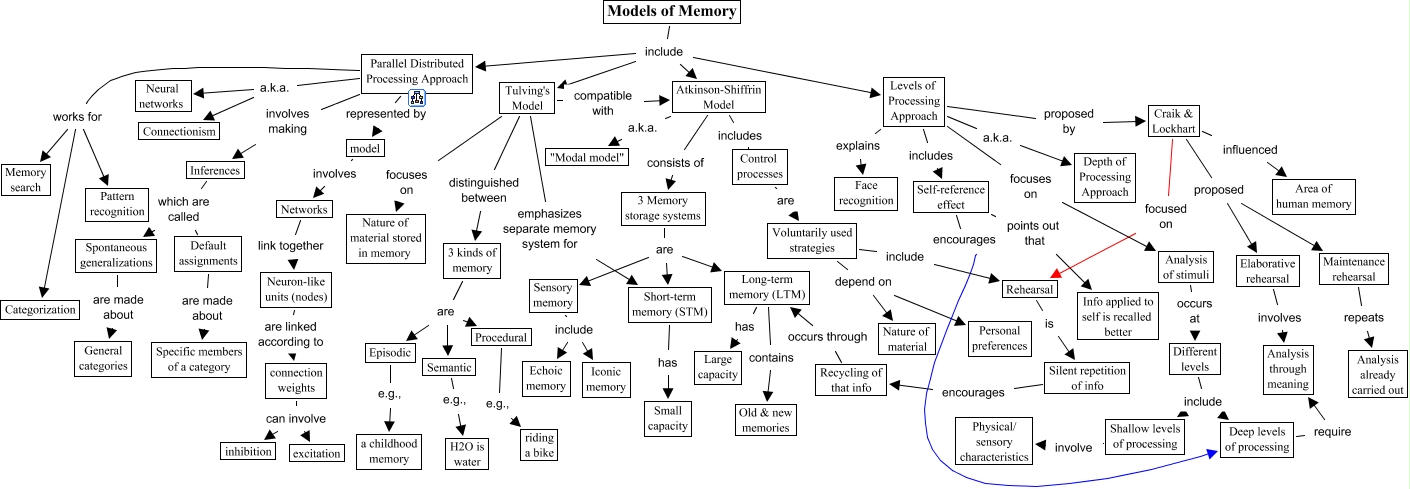 This Concept Map, created with IHMC CmapTools, has information related to: Memory Theories Version 2, Parallel Distributed Processing Approach a.k.a. Connectionism, Levels of Processing Approach includes Self-reference effect, Atkinson-Shiffrin Model includes Control processes, Tulving's Model focuses on Nature of material stored in memory, Tulving's Model distinguished between 3 kinds of memory, Rehearsal is Silent repetition of info, Parallel Distributed Processing Approach works for Pattern recognition, 3 Memory storage systems are Short-term memory (STM), model involves Networks, Models of Memory include Atkinson-Shiffrin Model, Craik & Lockhart influenced Area of human memory, Inferences which are called Default assignments, Short-term memory (STM) has Small capacity, Levels of Processing Approach explains Face recognition, Spontaneous generalizations are made about General categories, Parallel Distributed Processing Approach a.k.a. Neural networks, Silent repetition of info encourages Recycling of that info, Different levels include Deep levels of processing, Parallel Distributed Processing Approach works for Categorization, Tulving's Model emphasizes separate memory system for Short-term memory (STM)