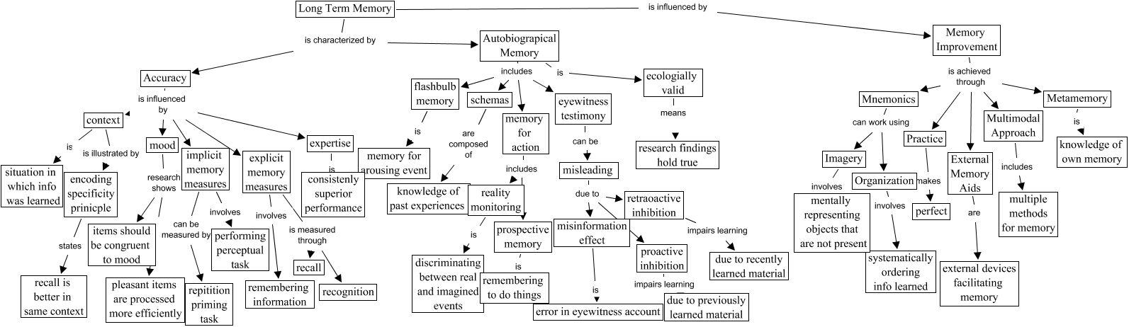 This Concept Map, created with IHMC CmapTools, has information related to: Memory - Long-Term Memory Version 1, mood research shows pleasant items are processed more efficiently, Imagery involves mentally representing objects that are not present, explicit memory measures is measured through recognition, Mnemonics can work using Organization, misinformation effect is error in eyewitness account, Memory Improvement is achieved through Practice, Memory Improvement is achieved through Metamemory, Long Term Memory is characterized by Autobiograpical Memory, misleading due to proactive inhibition, Long Term Memory is influenced by Memory Improvement, eyewitness testimony can be misleading, explicit memory measures involves remembering information, External Memory Aids are external devices facilitating memory, Memory Improvement is achieved through Multimodal Approach, Autobiograpical Memory includes eyewitness testimony, encoding specificity prinicple states recall is better in same context, misleading due to misinformation effect, Autobiograpical Memory includes memory for action, Autobiograpical Memory is ecologially valid, Practice makes perfect