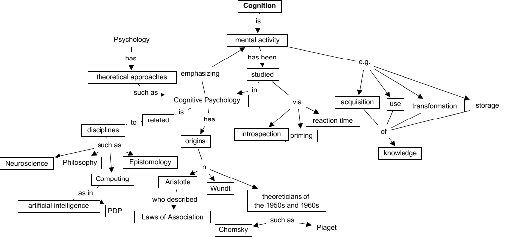 This Concept Map, created with IHMC CmapTools, has information related to: Introduction Version 5, origins in theoreticians of the 1950s and 1960s, mental activity e.g. storage, disciplines such as Computing, studied via priming, disciplines such as Philosophy, disciplines such as Neuroscience, mental activity has been studied, origins in Aristotle, acquisition of knowledge, Psychology has theoretical approaches, studied via reaction time, Cognition is mental activity, Computing as in artificial intelligence, studied via introspection, Cognitive Psychology is related, disciplines such as Epistomology, use of knowledge, Cognitive Psychology emphasizing mental activity, related to disciplines, Computing as in PDP