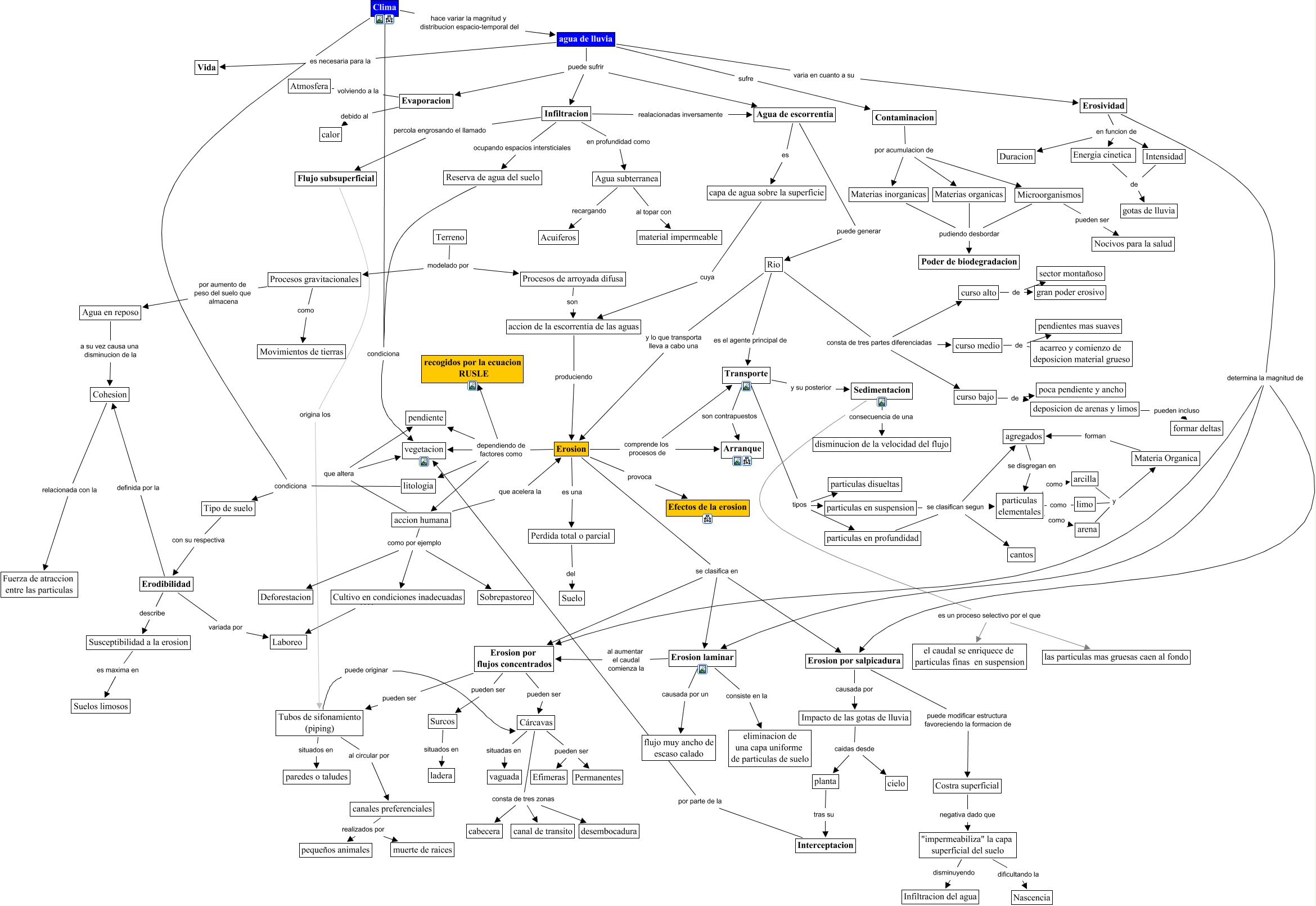 Este Cmap, tiene información relacionada con: erosion1, Erosion se clasifica en Erosion laminar, Cárcavas consta de tres zonas cabecera, Transporte son contrapuestos Arranque, Erosion comprende los procesos de Transporte, Erosion es una Perdida total o parcial, Cárcavas situadas en vaguada, agua de lluvia puede sufrir Evaporacion, Rio es el agente principal de Transporte, Contaminacion por acumulacion de Materias organicas, Sedimentacion es un proceso selectivo por el que el caudal se enriquece de particulas finas en suspension, Reserva de agua del suelo condiciona vegetacion, Impacto de las gotas de lluvia caidas desde cielo, Rio consta de tres partes diferenciadas curso bajo, "impermeabiliza" la capa superficial del suelo disminuyendo Infiltracion del agua, Susceptibilidad a la erosion es maxima en Suelos limosos, Transporte tipos particulas disueltas, Erosividad determina la magnitud de Erosion por flujos concentrados, accion de la escorrentia de las aguas produciendo Erosion, curso alto de sector montañoso, Transporte y su posterior Sedimentacion