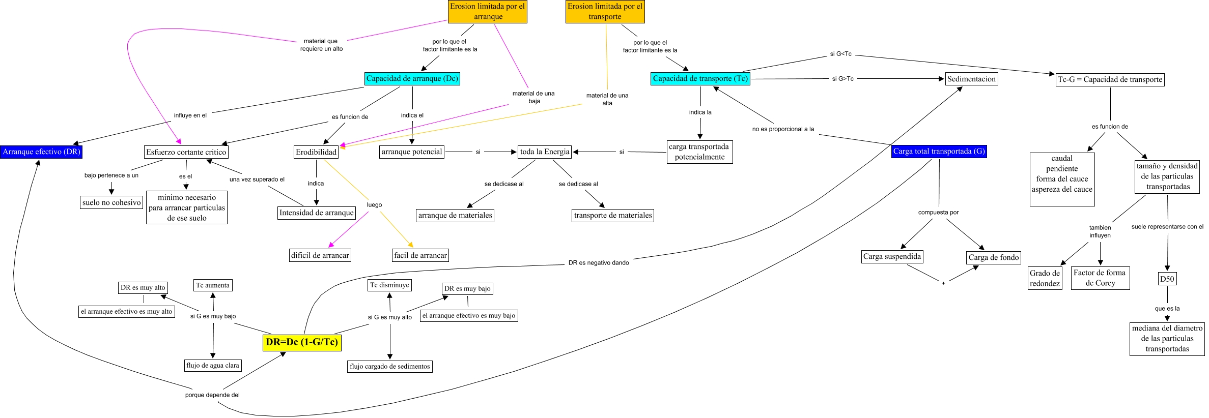 This Concept Map, created with IHMC CmapTools, has information related to: arranquetransp, Carga total transportada (G) porque depende del Arranque efectivo (DR), DR=Dc (1-G/Tc) si G es muy alto DR es muy bajo, Capacidad de transporte (Tc) si G>Tc Sedimentacion, Capacidad de arranque (Dc) es funcion de Esfuerzo cortante critico, Intensidad de arranque una vez superado el Esfuerzo cortante critico, Esfuerzo cortante critico bajo pertenece a un suelo no cohesivo, DR es muy alto ???? el arranque efectivo es muy alto, DR=Dc (1-G/Tc) si G es muy alto Tc disminuye, Erosion limitada por el arranque por lo que el factor limitante es la Capacidad de arranque (Dc), DR=Dc (1-G/Tc) si G es muy alto flujo cargado de sedimentos, Carga total transportada (G) compuesta por Carga de fondo, Capacidad de transporte (Tc) si G<Tc Tc-G = Capacidad de transporte, Carga total transportada (G) compuesta por Carga suspendida, Carga suspendida + Carga de fondo, Erosion limitada por el arranque material que requiere un alto Esfuerzo cortante critico, Erosion limitada por el arranque material de una baja Erodibilidad, tamaño y densidad de las particulas transportadas tambien influyen Factor de forma de Corey, DR=Dc (1-G/Tc) si G es muy bajo DR es muy alto, Tc-G = Capacidad de transporte es funcion de tamaño y densidad de las particulas transportadas, D50 que es la mediana del diametro de las particulas transportadas