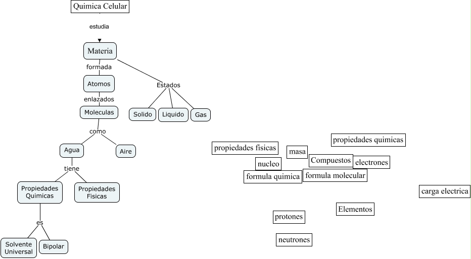 Este Cmap, tiene información relacionada con: ¿Que es la Quimica_, Atomos enlazados Moleculas, Agua tiene Propiedades Fisicas, Moleculas como Aire, Propiedades Quimicas es Bipolar, Quimica Celular estudia Materia, Materia formada Atomos, Propiedades Quimicas es Solvente Universal, Agua tiene Propiedades Quimicas, Moleculas como Agua