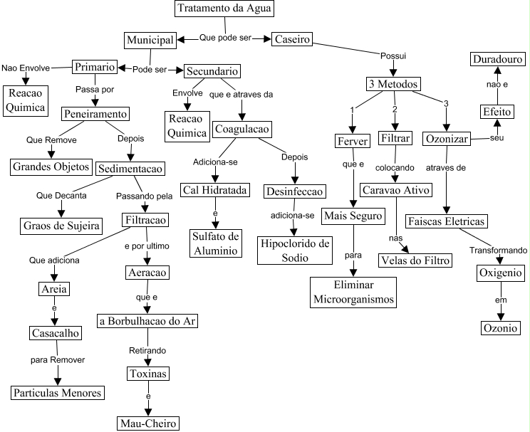 Esse mapa conceitual, produzido no IHMC CmapTools, tem a informação relacionada a: _TratamentodaAgua_, Tratamento da Agua Que pode ser Caseiro, Sedimentacao Passando pela Filtracao, Filtrar colocando Caravao Ativo, Aeracao que e a Borbulhacao do Ar, Municipal Pode ser Primario, Ozonizar atraves de Faiscas Eletricas, Areia e Casacalho, Filtracao e por ultimo Aeracao, Municipal Pode ser Secundario, Primario Passa por Peneiramento, 3 Metodos 2 Filtrar, Faiscas Eletricas Transformando Oxigenio, Casacalho para Remover Particulas Menores, Primario Nao Envolve Reacao Quimica, a Borbulhacao do Ar Retirando Toxinas, Cal Hidratada e Sulfato de Aluminio, Coagulacao Depois Desinfeccao, Efeito nao e Duradouro, Secundario Envolve Reacao Quimica, Ferver que e Mais Seguro