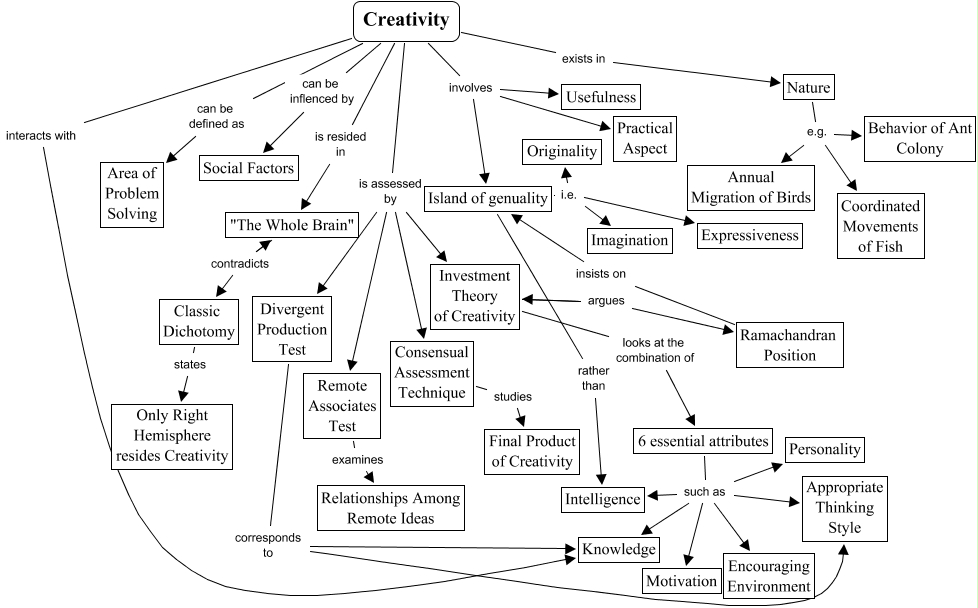 This Concept Map, created with IHMC CmapTools, has information related to: Second, 6 essential attributes such as Knowledge, Divergent Production Test corresponds to Appropriate Thinking Style, 6 essential attributes such as Motivation, Island of genuality rather than Intelligence, 6 essential attributes such as Intelligence, Creativity is assessed by Divergent Production Test, Creativity involves Island of genuality, Nature e.g. Coordinated Movements of Fish, Creativity is assessed by Investment Theory of Creativity, Creativity exists in Nature, Creativity involves Practical Aspect, Creativity is assessed by Remote Associates Test, Creativity interacts with Knowledge, Remote Associates Test examines Relationships Among Remote Ideas, Island of genuality i.e. Expressiveness, Ramachandran Position insists on Island of genuality, Island of genuality i.e. Imagination, 6 essential attributes such as Encouraging Environment, Nature e.g. Annual Migration of Birds, Creativity is resided in "The Whole Brain"