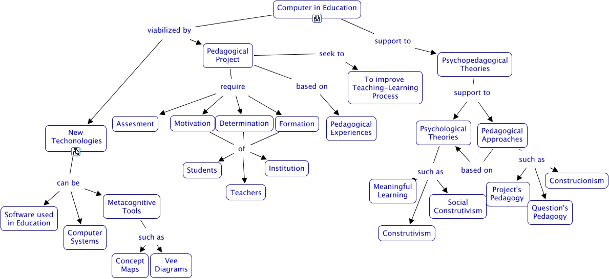 Este Mapa Conceitual tem informações relacionadas a: Computer in Educaton, Psychopedagogical Theories support to Psychological Theories, Pedagogical Project require Assesment, Determination of Students, Computer in Education viabilized by New Techonologies, Motivation of Institution, Pedagogical Project require Formation, Formation of Institution, New Techonologies can be Metacognitive Tools, Determination of Institution, Pedagogical Approaches such as Construcionism